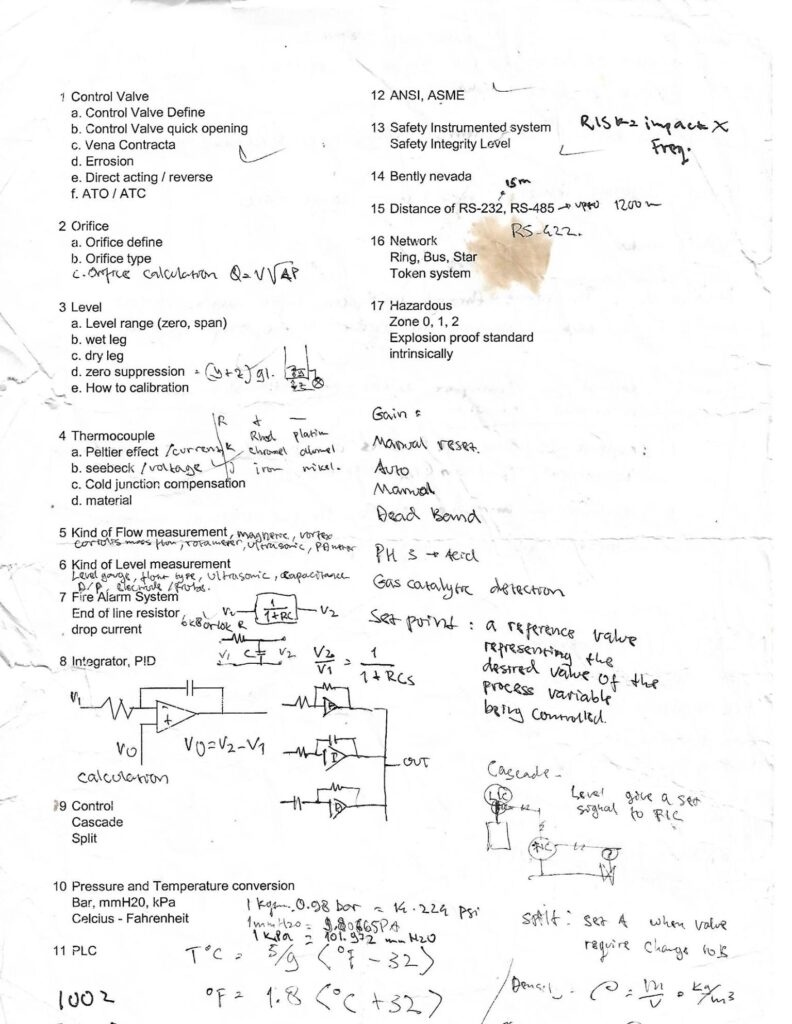 Target pertama kali mengikuti tes, cari pengalaman, ingin mengetahui bagaimana prosesnya.Saat itu test tulis hanya menjawab alakadarnya, selebihnya sibuk mencatat soal-soal sebagai bahan untuk belajar. Dari tes pertama kali tersebut menjadi dasar selanjutnya persiapan mengikuti tes di berbagai negara di Timur tengah sebagai teknisi instrument yang ternyata walaupun berbeda-beda perusahaan tapi secara garis besar soal yang diujikan serupa topik nya. Misalnya mengenai control valve, pengukuran DP transmitter/orifice, SIL, PLC, PID controller, I/P transducer, temperature (T/C, RTD) dan lain2.
